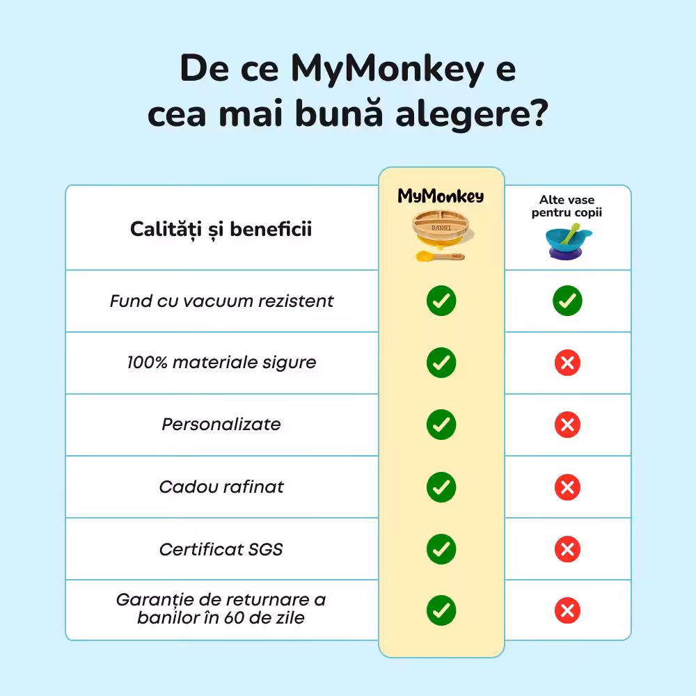 Tot ce oferim este sigur, calitativ și delicat - creat cu gândul la micuții oameni. Dacă nu am folosi-o pentru proprii noștri copii, nu lăsăm nici un alt copil să o folosească. Iată de ce cu achiziția ta de la MyMonkey beneficiezi de garanție de 60 de zile.