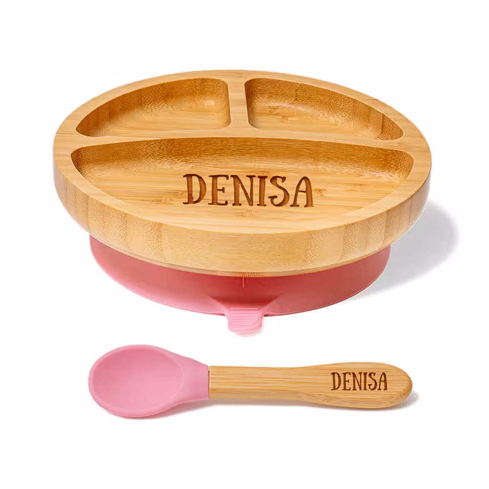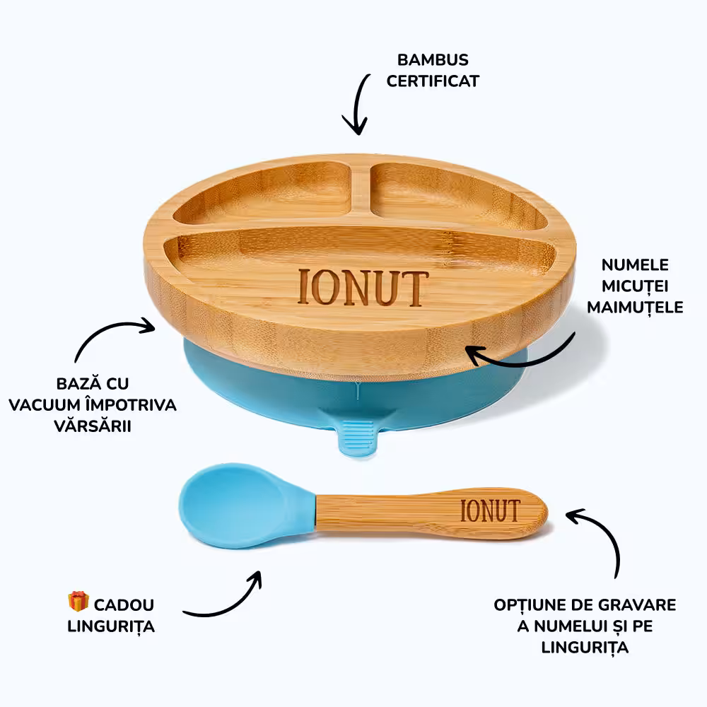 • Farfurie din bambus, gravată cu numele copilului