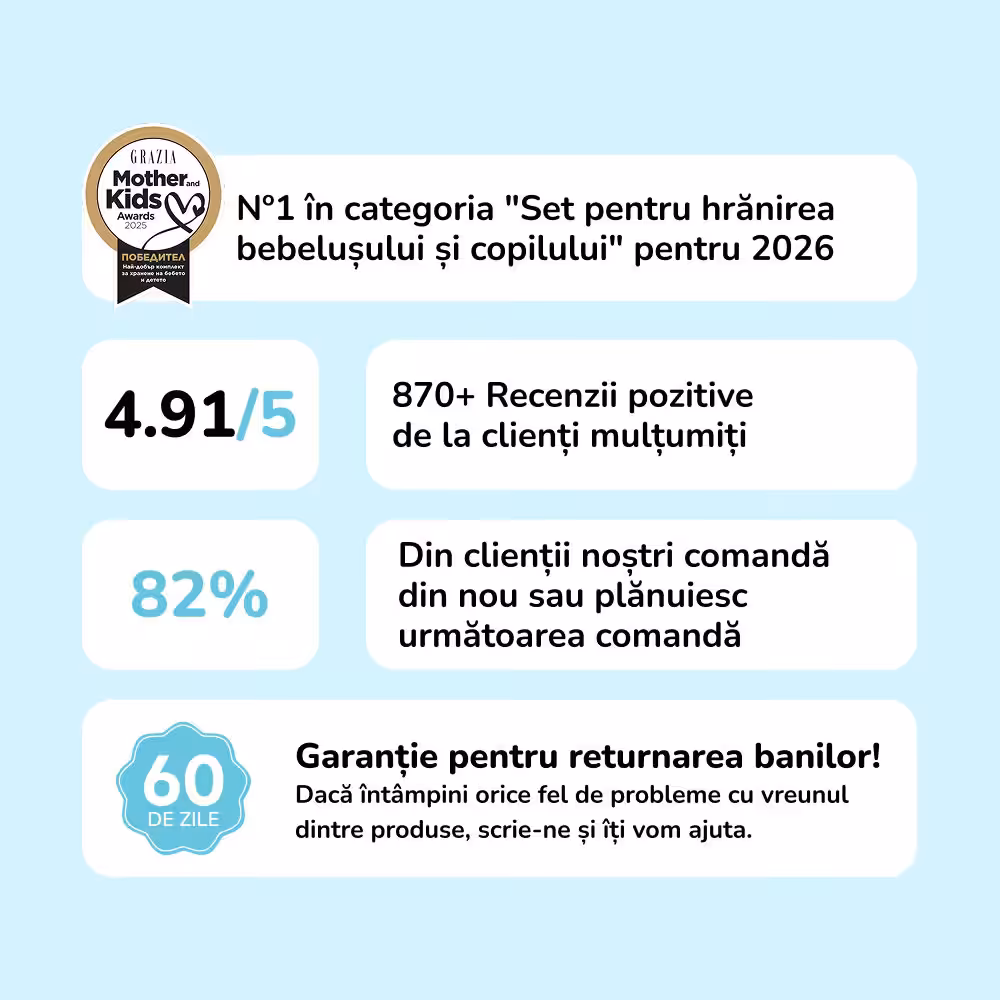 👁️ Îmbunătățesc coordonarea mână–ochi – faptul că micuțul exersează să ducă tacâmurile la gură susține formarea timpurie a conexiunilor neuronale care rafinează mișcările.