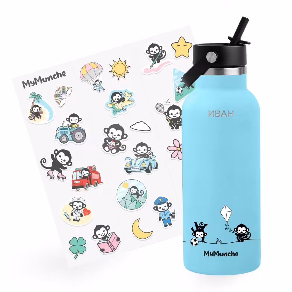 С вместимост 550 мл, двойна стена от неръждаема стомана и две сменящи се капачки, тя осигурява удобство и свежест без протичане. Силиконовият предпазител на дъното гарантира здравина при игра.